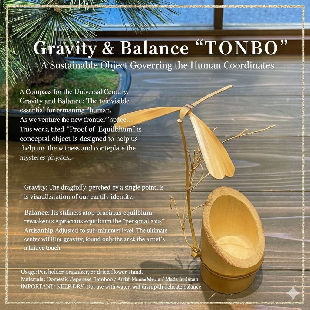 本品は、日本人作家・松原武蔵が、その根源的な理(ことわり)を一本の竹に託した「均衡の証」。来るべき宇宙世紀に備え、物理法則の神秘を見て、感じ、意識するためのサステナブル・オブジェです。